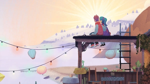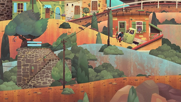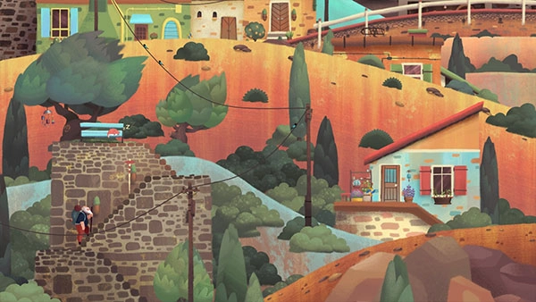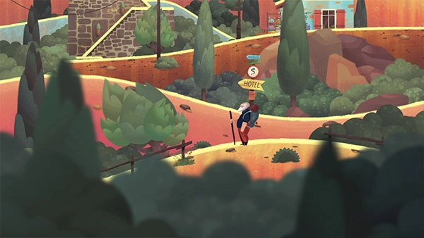 3、移动至椅子前:直接点击远处的房屋,老人会自动寻路,跨越各个山谷,走到房屋前的椅子旁坐下。点击屋檐上的情侣,情侣会进行一些互动,随后老人便开始回忆……回忆结束后即可进入下一关。
