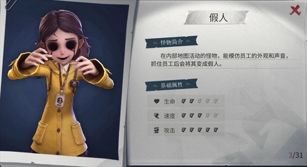 简介:在内部地图活动,能模仿员工的外观和声音,击杀玩家后会将其变成新的假人。