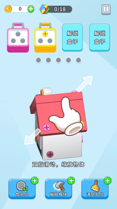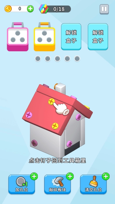 1、在魔趣网安装游戏后打开,点击钉子可使其返回工具箱,仅相同颜色的钉子才能消除。