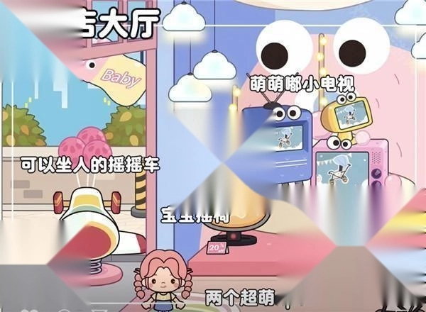 1、母婴店大厅:可以坐人的摇摇车红白相间十分的喜人,萌萌嘟的小电视,新的娃娃车,宝宝摇椅,两个超软萌的NPC。