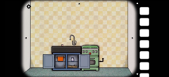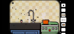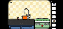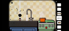 4、我们回到厨房,把锅装满水,调整一下旁边的煤气开关,用火柴点着火,再把锅放上去,水就会煮沸了,那颗蛋就能毫无顾虑的丢进去了,再拿出来,就显示的是煮熟的蛋了,此时你可以看到水龙头旁边有一个专门装蛋的架子,蛋放上去,用勺子敲碎壳,这时候!方块就出现了!点击多次,取得方块。