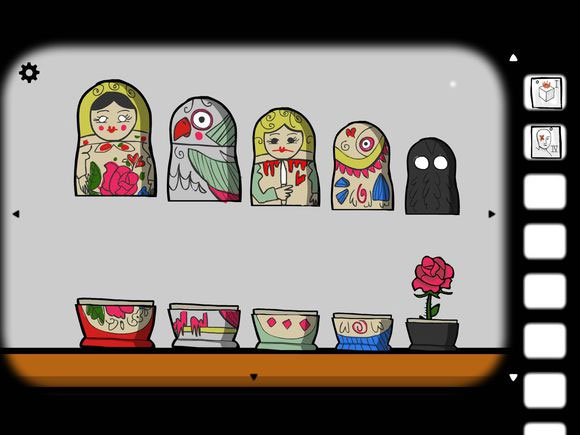 7、点击柜子里的套娃,按顺序把它们逐个摆出来。黑影套娃里面藏着花,将花移到女人套娃上并合起来,再次打开就会出现鱼,按照这样的方式依次操作,最后就能得到钥匙。