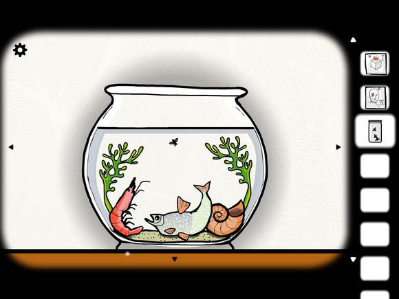 9、点击鱼缸进入鱼缸场景,将萤火虫投入其中,点击左侧水草让萤火虫向右飘入贝壳,会有一根手指顶出并点亮萤火虫。接着点击右侧水草使萤火虫飘进鱼的口中,鱼吃掉萤火虫后消失,随即出现钥匙。