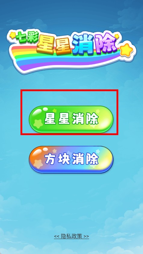 1进入游戏后,首先映入眼帘的是带有彩虹与星星元素的启动界面,点击星星消除按钮,就能进入星星消除游戏模式,开启消除挑战之旅。