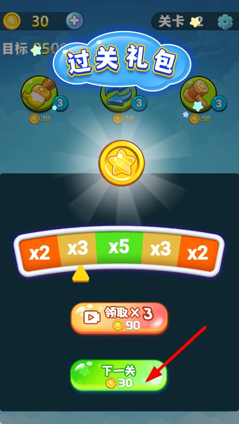 4、成功通关后,会出现过关礼包界面,可领取金币等奖励,点击下一关按钮,就能进入新的关卡继续挑战。