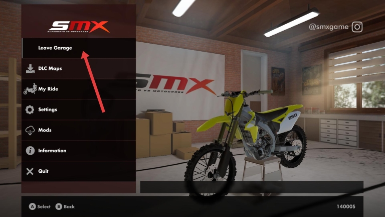 1选择“离开车库”的功能选项,完成出车操作,以进入摩托车驾驶挑战的待开始状态,为接下来的骑行环节预先做好各项准备。