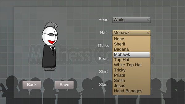 2、选择右侧的head、hat、glass、shirt等外观选项,自定义发型、眼镜、肤色以及衣服,完成后可点击Save进行保存;