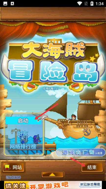 1、游戏初始界面有主页面标题,点击启动按钮,可进入游戏,开始海盗冒险之旅,若想结束游戏,点击结束按钮即可。