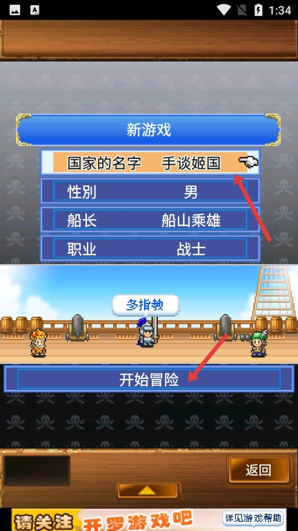 2、进入新游戏设置界面,可设置国家名字、性别、船长和职业等,设置完成后,点击开始冒险,开启海盗冒险,探索游戏世界。