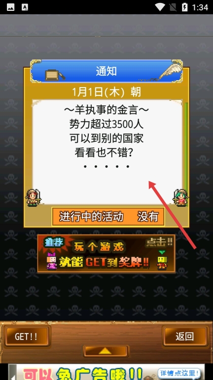 3、游戏进程里会弹出通知界面,展示羊执事的金言之类的内容,还会提示当势力人数突破3500时可以前往其他国家探索;熟悉这些提示信息,能帮助玩家更好地规划游戏的发展路径。