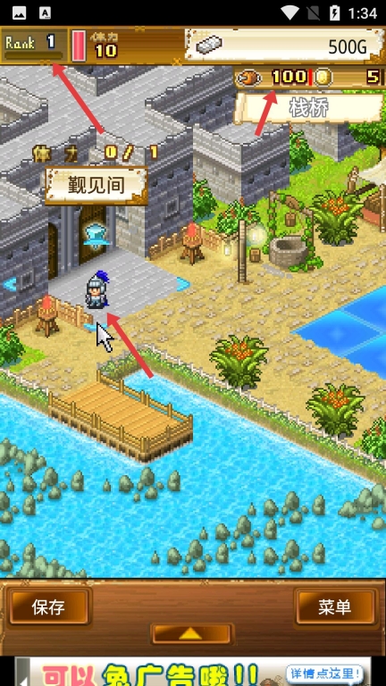 4、进入游戏场景后,能看到角色、建筑等元素,界面上会显示等级、体力、金币等信息,玩家可操控角色移动,探索觐见间、栈桥等区域,进行冒险活动。