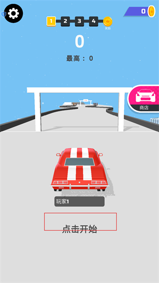 1、玩家结束游戏后回到游戏初始界面,点击开始按钮图标,就能驾驶红色赛车驶入赛道,开启漂移竞速的旅程。