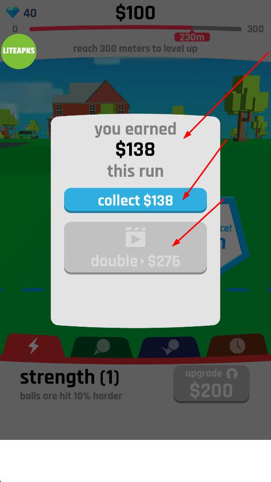 4、每一轮结束后,会弹出收益提示窗口,点击“collect138”按钮可直接领取金币,也可以选择观看广告来双倍领取金币,通过积累金币能够提升等级。