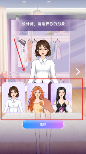 1、在形象选择界面,点击下方红框内的任意一个设计师形象,再点击【选择】按钮进入游戏。
