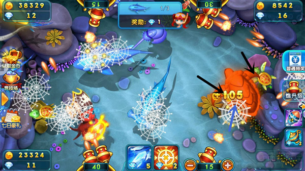 不少刚接触游戏的新手,因为对玩法不熟悉,看到游过来的鱼就盲目猛打,结果鱼没打着,还白白耗了不少金币。实际上炮台方向是可以调整的,只要触摸屏幕上鱼的身体位置,就能改变炮台的朝向。比如乌龟这类目标,龟壳坚硬、防御高,就算近在眼前也未必能击中,所以要记住:调整好炮台方向,瞄准它们脆弱的四肢攻击才行。