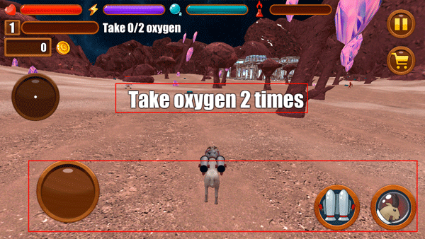 进入游戏后,通关的目标是收集到两罐氧气;游戏界面左侧设有方向控制键,用于操控移动,右侧则是飞行键与攻击键。