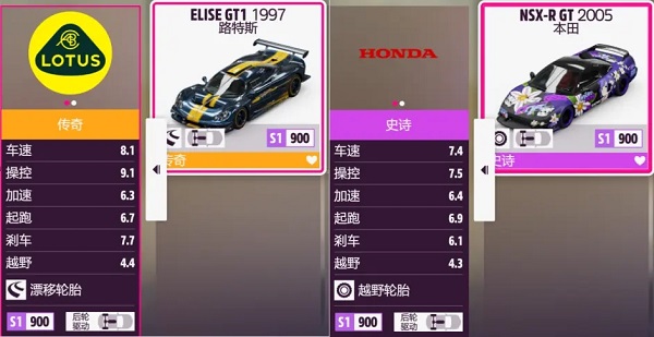 有两台常见的s1级别公路车,其中右边的本田火箭nsxr gt是大马力后驱车的代表,车速评分达到7.4;左边的路特斯gt1则作为操控型车的代表,车速评分更高,为8.1。