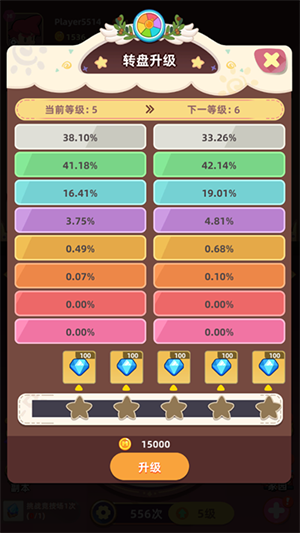 轮盘的升级难度会逐步增加,初期升级轮盘仅需一枚星星,随着轮盘等级的提升,后续升级所需的星星数量会越来越多。每次用金币升级只能点亮一颗星星,当所有星星都被点亮时,当前轮盘的升级就完成了。