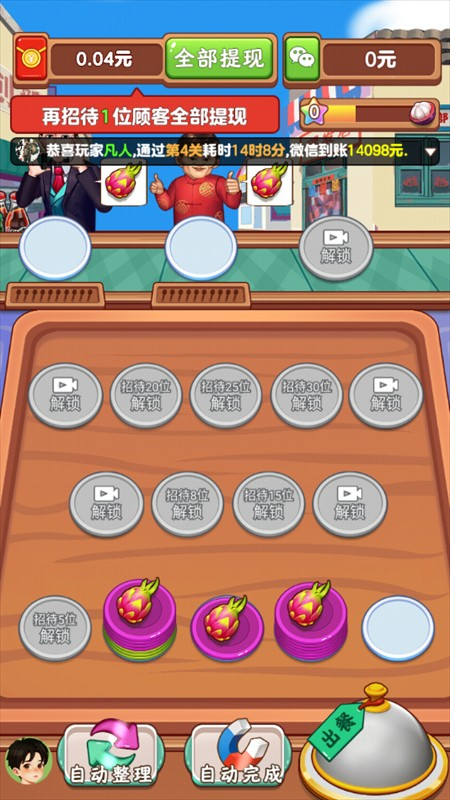3、把菜品交付给外卖员,整个游戏流程就算完成了。另外,通过对应的关卡后我们还能解锁红包,达成相应目标就能进行提现操作。