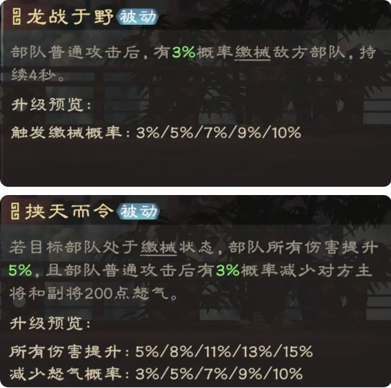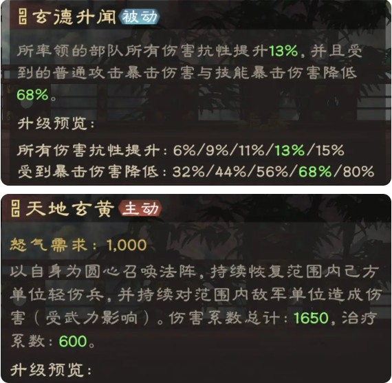 许褚的培养建议同上,而刘备所有技能都对部队的坦度有不少提升,不缺治疗手段的情况下,建议优先培养3技能,就算没凑够资源升星,伤害和治疗兼具的主动技能也很香。