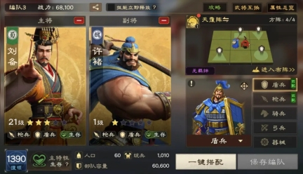 如果手里恰好有刘备,不妨组一个超级生存盾,选用刘备为主将,许褚为副将,两名武将都擅长带领枪兵和盾兵,同样是提升部队的生存属性,契合度也是相当高的。