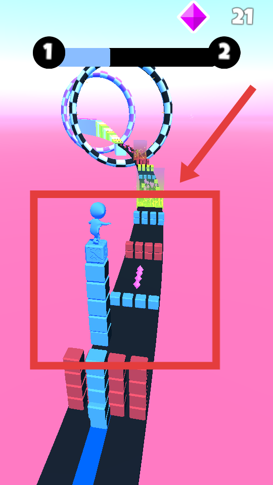 2、跑酷中操控蓝色小人在方块上跳跃,避开不同颜色方块,沿着赛道前行,收集道具冲向终点。