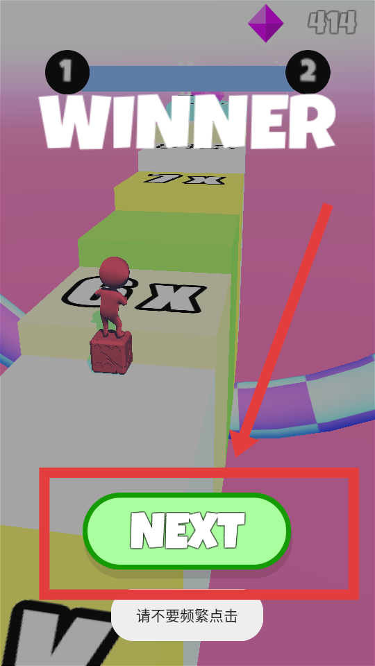 3、成功到达终点后界面显示胜利者及下一关按钮,点击该按钮进入下一个关卡继续挑战。