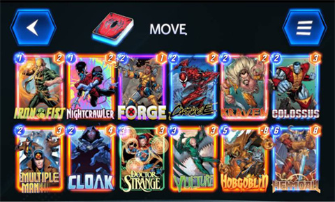 中文卡表: 铁拳、夜行者、锻造者、克莱文、钢力士、复制人、斗篷、奇异博士、秃鹫、恶鬼、海姆达尔