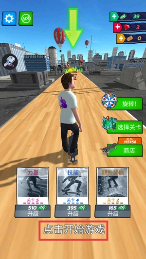 1、打开游戏后点击开始游戏按钮进入关卡选择界面准备进入滑板挑战流程。