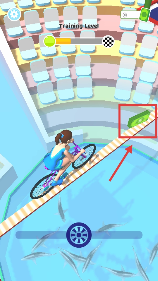 2、骑行过程中,收集道路上的绿色钞票道具,积累游戏资源。