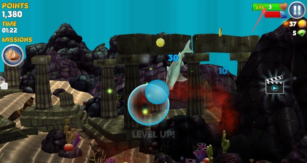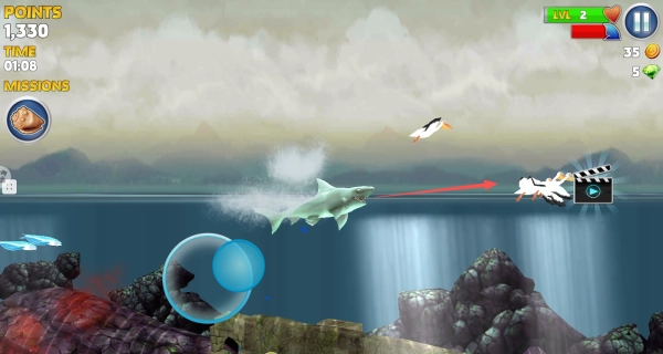 3、时刻留意右上角的等级和生命值条,在生命值充足时积极捕食升级,等级提升后鲨鱼能力会增强。