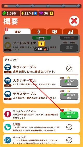 3、点击施工按钮,可对餐厅进行扩建,增加可容纳的顾客数量,带来更多收益。