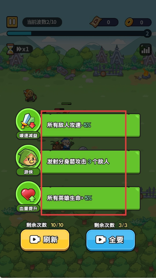 2、选择增益效果,如降低敌人攻速、提升英雄生命等,增强队伍战斗能力,顺利推进关卡。