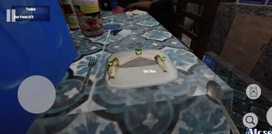 5、滑动左下角的滑竿来到桌子旁左下点击盘子就可以开始吃饭了;
