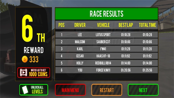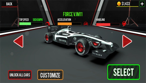 3、【性能赛车】:高度性能的赛车机制,尝试解锁出更多款式的方程式赛车类型。