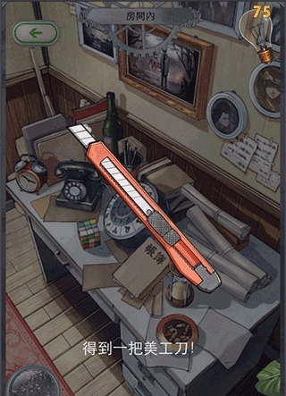 2、接着检查桌面,点击笔筒获取美工刀,打开道具栏选中美工刀后,对着墙上的“SAVEME”字样进行切割,就能得到一枚双子座硬币。