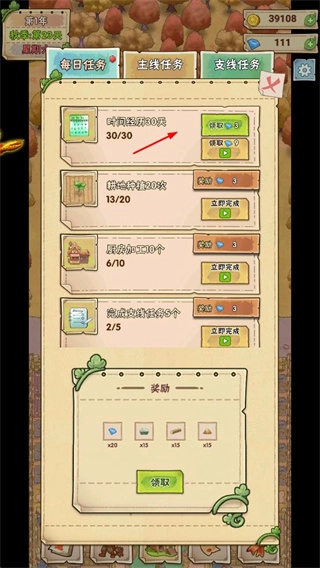 1、完成每日任务、主线任务与支线任务,领取钻石、材料等奖励,为农场发展提供助力。