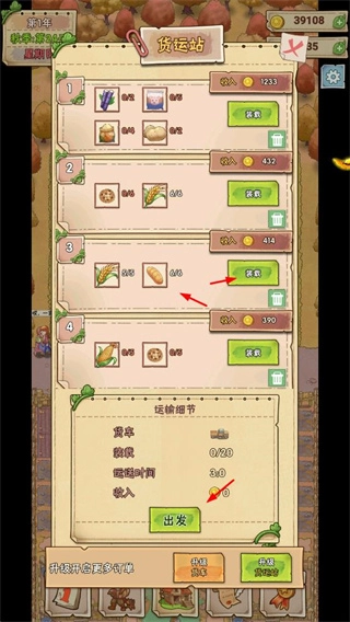 2、在货运站界面,装载加工好的食品进行运输,获取金币收入,运输收益可通过升级货车和货运站提升。