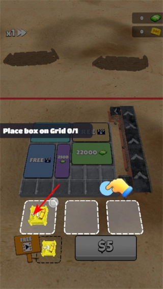 4、点击绿色的$1按钮购买箱子,完成“Click to Buy a Box0/1”任务,通过不断购买和布局箱子来推进游戏进程。
