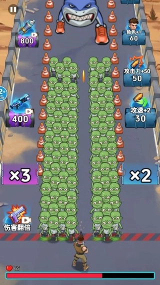 1、操控武器在跑酷路线前进,途中需精准穿越透明门,选择适合的门触发效果,为后续对抗野兽和僵尸做好准备。