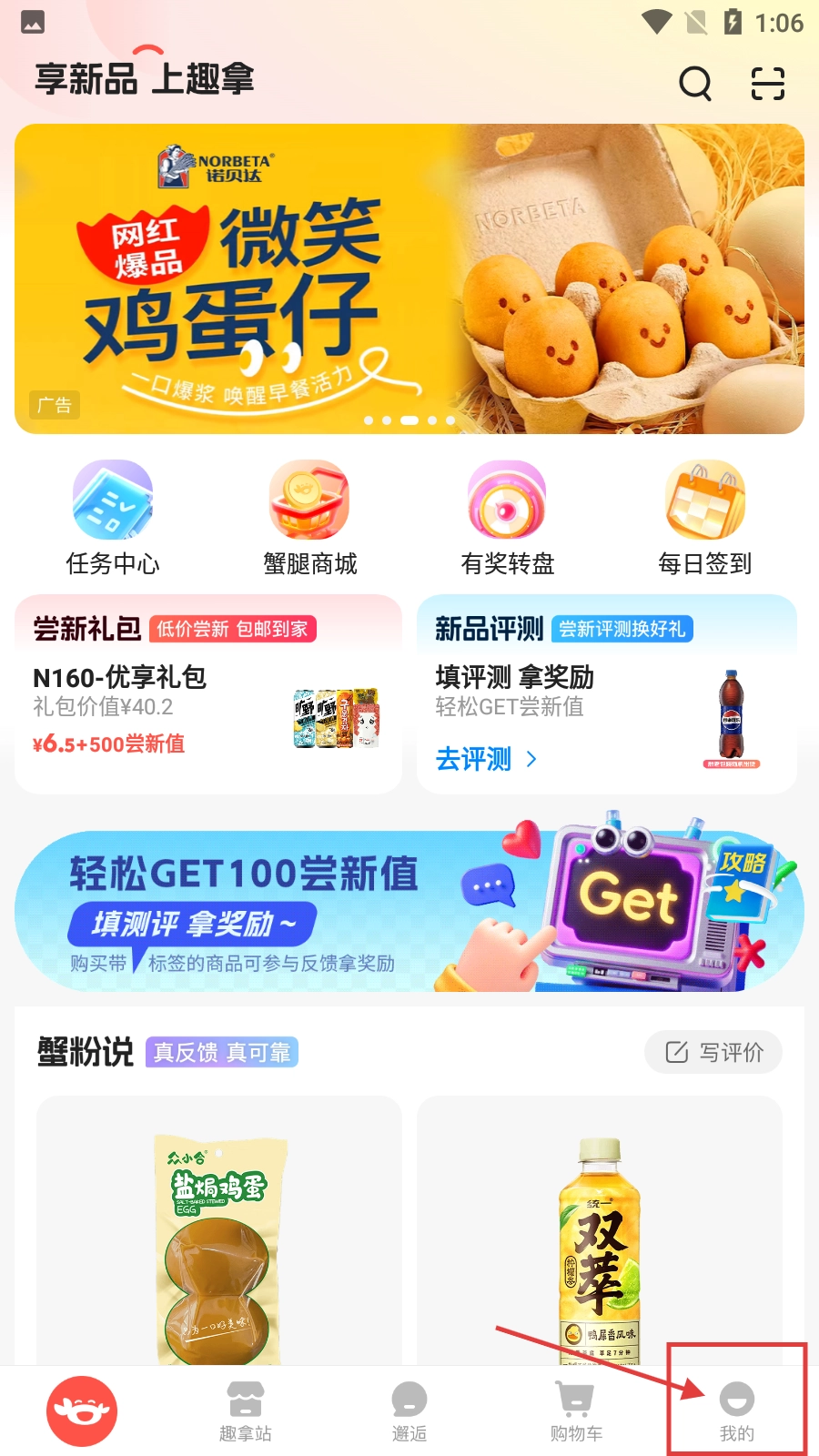 1、在趣拿首页,点击右下角的【我的】按钮,即可进入个人中心页面。