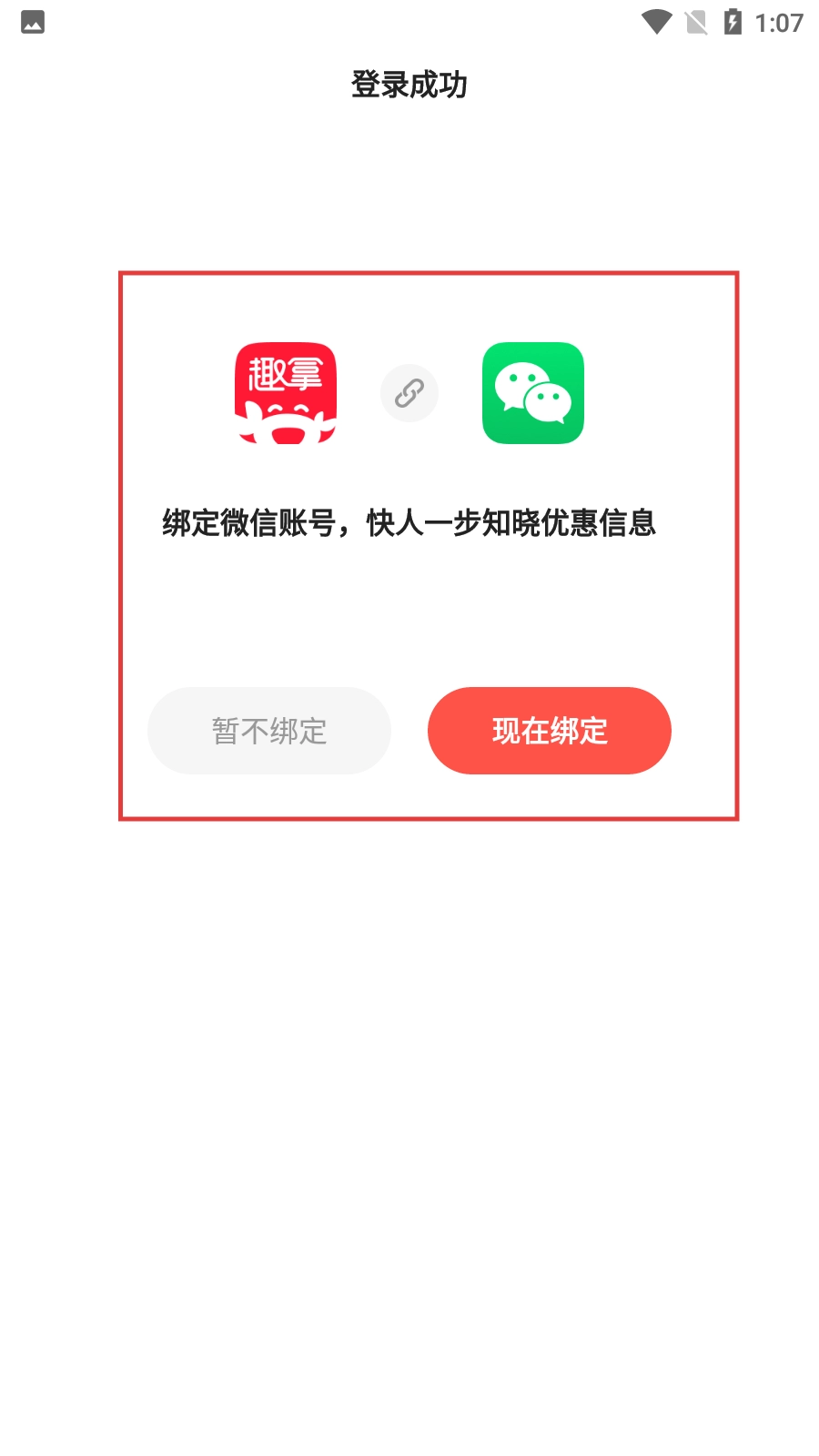 4、登录成功后,可选择【暂不绑定】或【现在绑定】微信账号,绑定后可及时知晓优惠信息,方便使用的任务中心、商城等功能。
