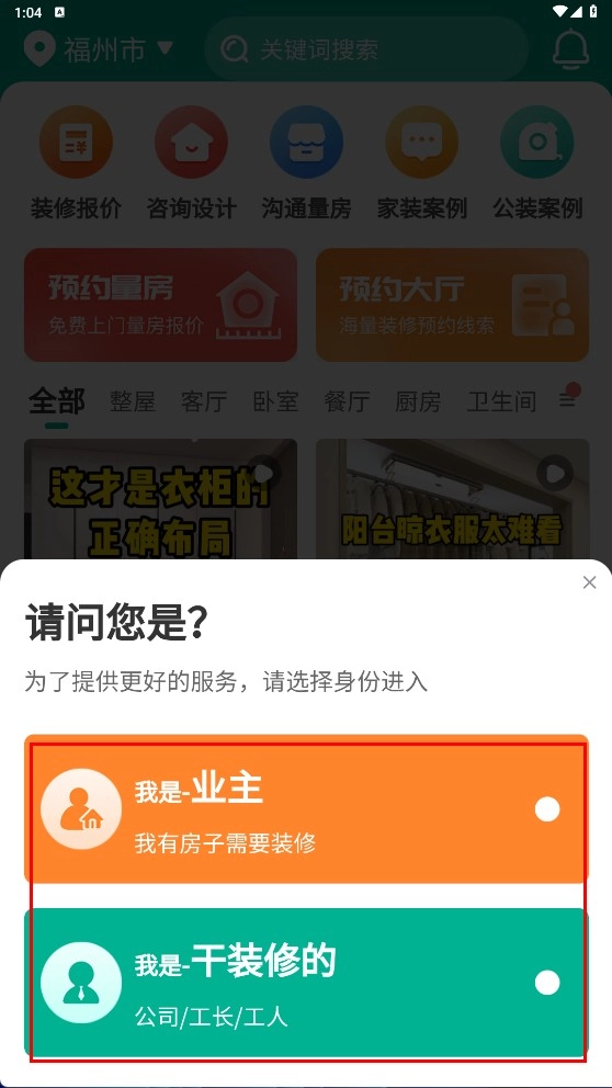 在身份选择界面,你可以选择【我是-业主】或者【我是-干装修的】这两个身份选项进入系统。
