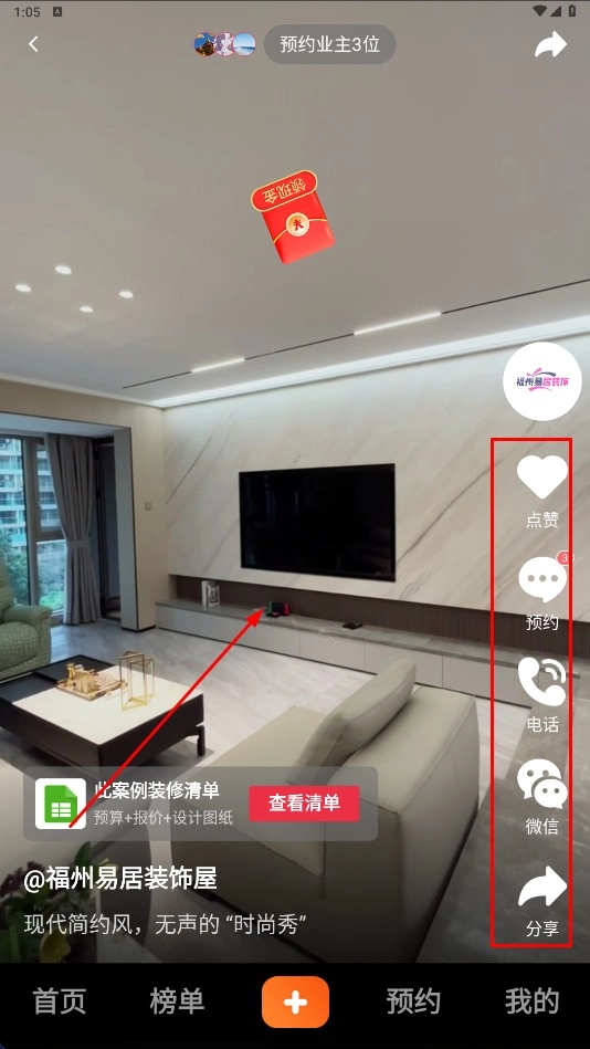 4、在案例详情页,可点击【点赞】【预约】【电话】等功能按钮,还能查看装修清单。