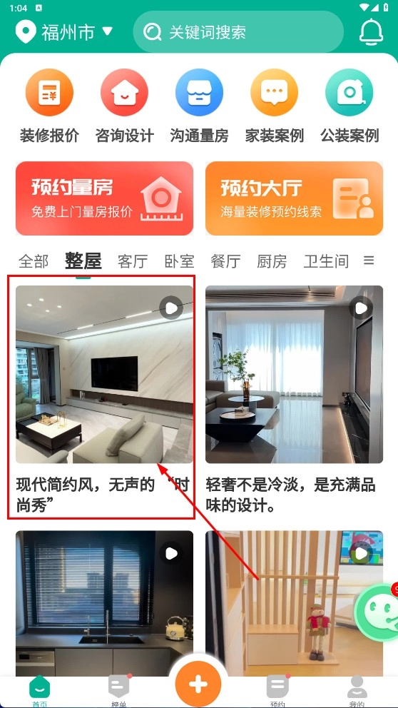 3、在整屋案例列表,点击感兴趣的案例,如【现代简约风-案例名称】,进入案例详情页。