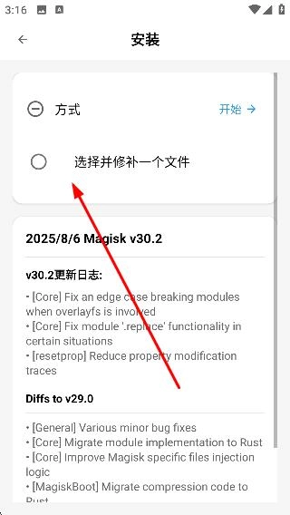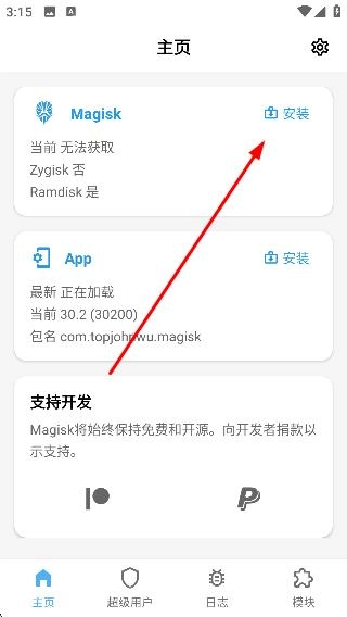 1、点击【安装】按钮,即可进入Magisk的安装界面。