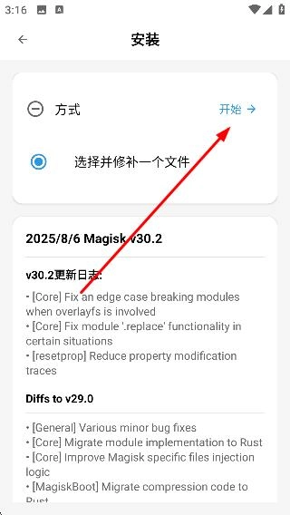 3、选择安装方式后点击【开始】,启动Magisk的安装流程。