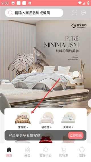 1、在晚安家纺首页找到并点击【套件区】选项,即可进入对应的商品列表页面。