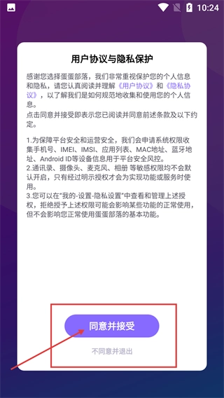 1、第一次使用蛋蛋部落时,需要点击【同意并接受】按钮,才能进入登录注册页面。