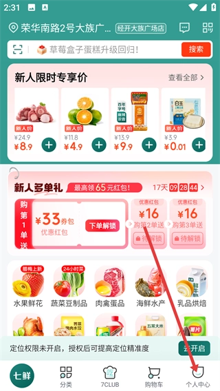 1、打开七鲜APP后,在首页底部找到【个人中心】按钮并点击,即可进入个人中心页面。